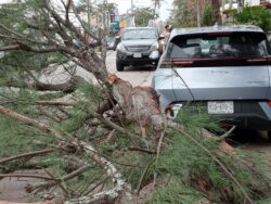 Camión de Castores tira parte de árbol y daña un automóvil en Honorato Domínguez y B. Simonín se le hace llamado a Protección Civil la unidad quedó detenida