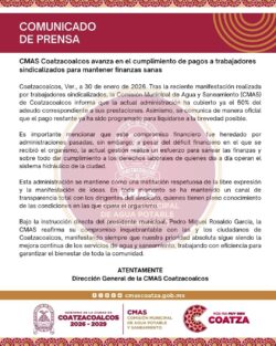 Coatzacoalcos, Ver., a 30 de enero de 2026. Tras la reciente manifestación realizada por trabajadores sindicalizados, la Comisión Municipal de Agua y Saneamiento (CMAS) de Coatzacoalcos informa que la actual administración ha cubierto ya el 50% del adeudo correspondiente a sus prestaciones. Asimismo, se comunica de manera oficial que el pago restante ya ha sido programado para liquidarse a la brevedad posible.