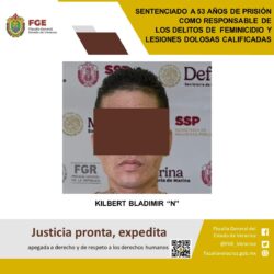 Coatzacoalcos, Ver., 9 de febrero de 2026.- La Fiscalía General del Estado, a través de la Fiscalía Regional Coatzacoalcos, obtuvo de un juez una sentencia condenatoria de 53 años de prisión en contra de Kilbert Bladimir “N”, como responsable de los delitos de feminicidio y lesiones dolosas calificadas, cometidos en agravio de dos víctimas cuyas identidades se encuentran legalmente resguardadas.